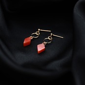 シャープなフォルムと、深みのある赤い菱形のチャームが組み合わさり、シンプルながらも強い存在感を放つピアスです。
